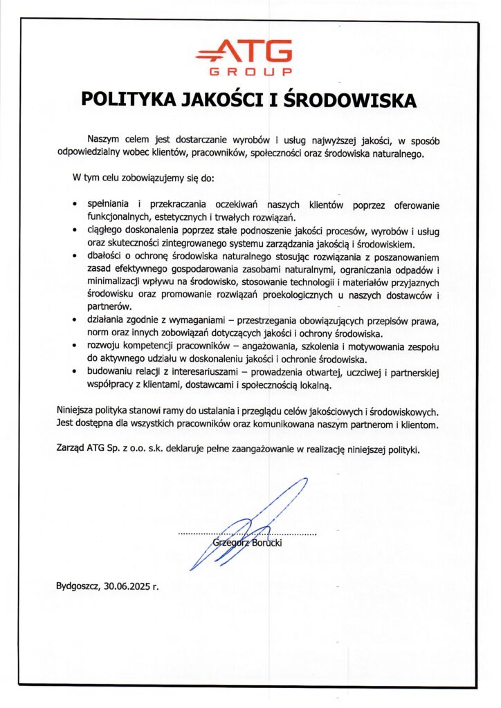 W ATG stawiamy kolejny krok w rozwoju – właśnie wdrożyliśmy Politykę Jakości oraz System Zarządzania obejmujący pełen zakres naszych usług. Kierowani doświadczeniem Prezesa Grzegorza Boruckiego, wzmacniamy w ten sposób pozycję marki ATG na rynku oraz potwierdzamy nasze dążenie do ciągłego doskonalenia.